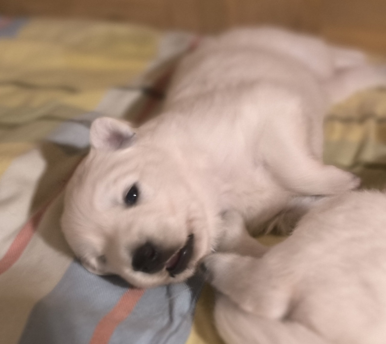 Mit diesem Alter beginnen die Welpen alles, was nicht niet- und nagelfest ist, in Besitz zu nehmen. Der Drang nach mehr Bewegung und die Neugierde auf