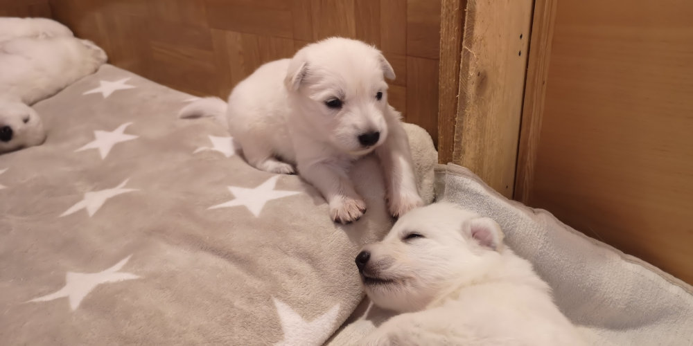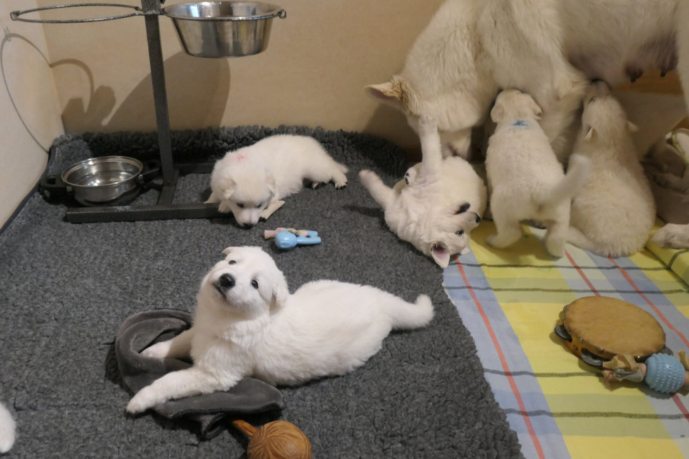 Die Wurfkiste wird zu klein und vor allem zu langweilig. Man muss seine Welpen nur genau beobachten um zu erkennen, ob ihre Entwicklung physisch wie psychisch so weit fortgeschritten ist, dass der Aktionsradius erhöht werden kann. Dies ist der Zeitpunkt wo die Welpen mit der Mutter in das Hundezimmer umziehen.