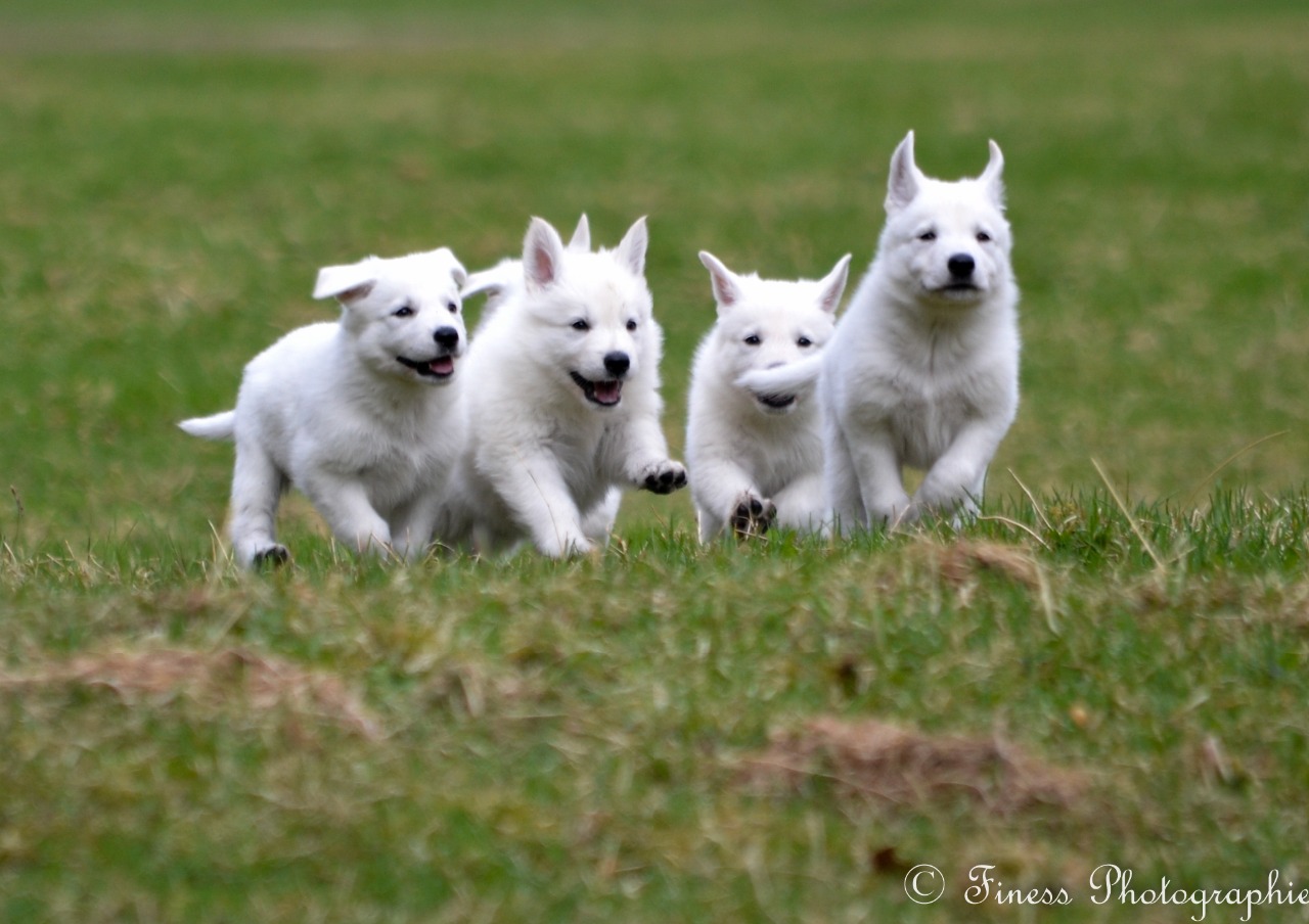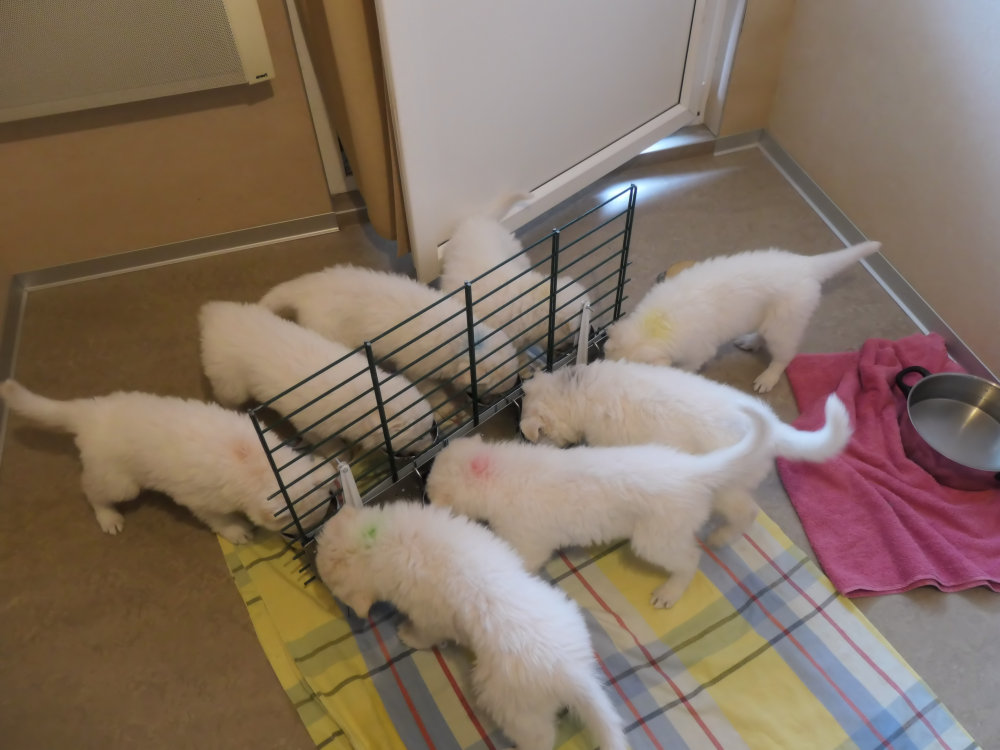 Kleinere Rangordnungskämpfe beginnen. Je nach Wurfgröße und Milchleistung der Hündin wird in der 3.-4. LW mit der Zufütterung begonnen. Eine Fütterung mit Trockenfutter empfehle ich meinen Welpenkäufern erst ab der 12. Lebenswoche. Da die Welpen regelmäßig von ihren zukünftigen Herrchen oder Frauchen besucht werden, kann schon im Vorfeld wichtiges besprochen werden. Hier freue ich mich besonders, wenn sich die Leute Gedanken machen und möglichst viele Fragen stellen wie z.B. über Ernährung, die ersten Tage zu Hause, Ausbildung, Ausstellungen usw.