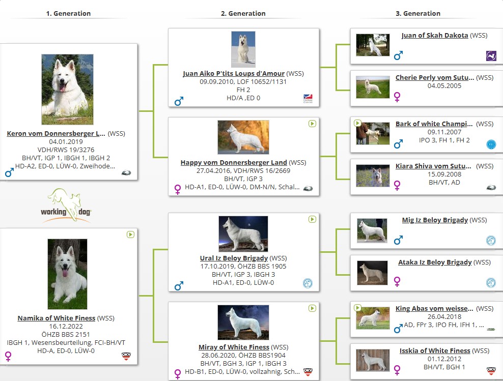 Beide Eltern haben die besten Gesundheitsergebnisse und werden sportlich geführt. Leider konnte Namika ihre IGP 1 nicht mehr ablegen,da die Schutzhundearbeit in Österreich verboten wurde.